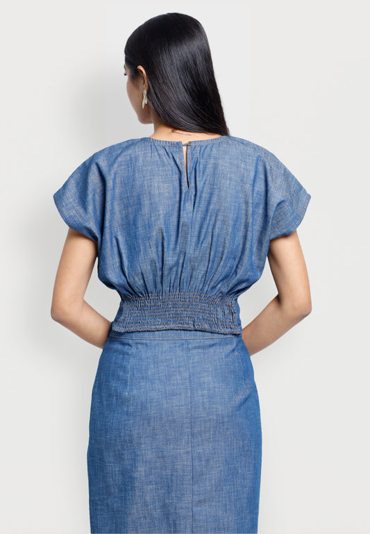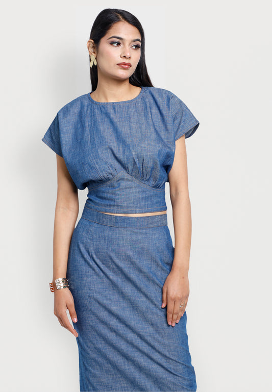 Blue Denim Effect Crop Top & Midi Skirt Co-ord Set