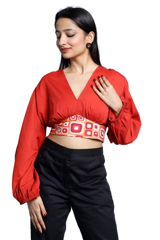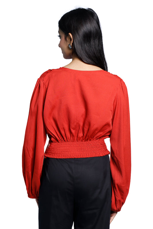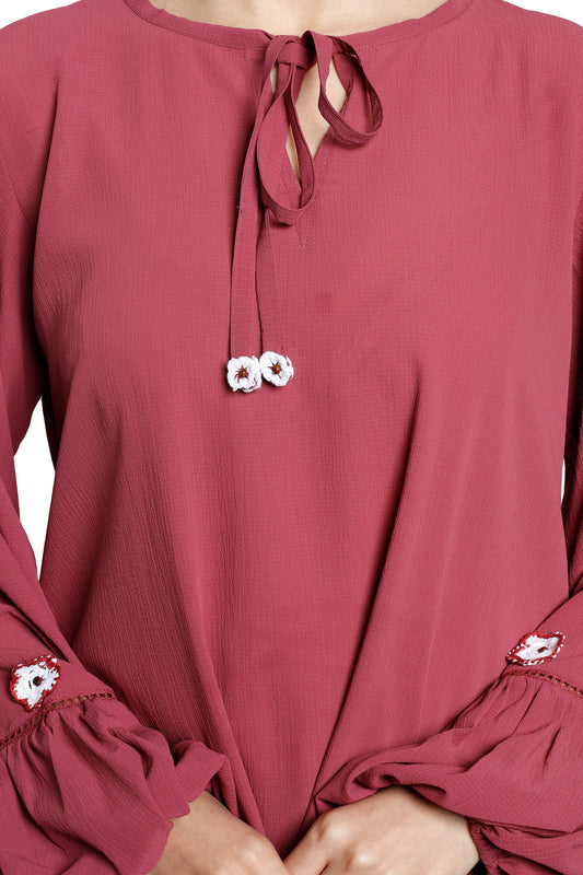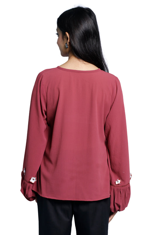 Rust‑Hued Balloon‑Sleeve Crochet‑Flower Chiffon Top