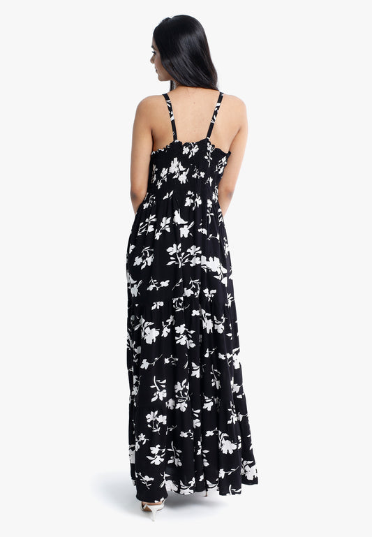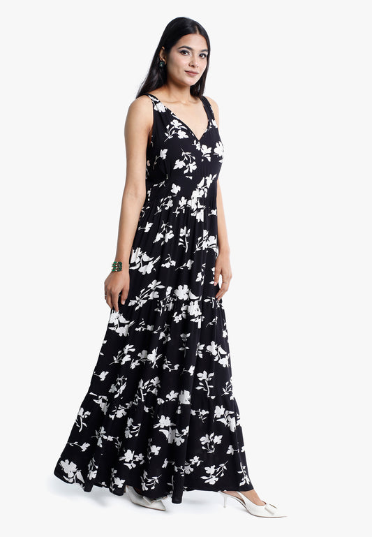 Elegant Black & White Floral Rayon Maxi Dress