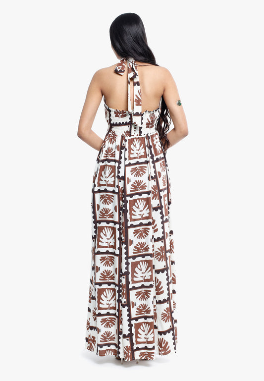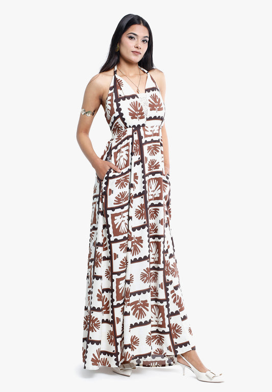 Geometric Flower Pattern Halter Neck Maxi Dress